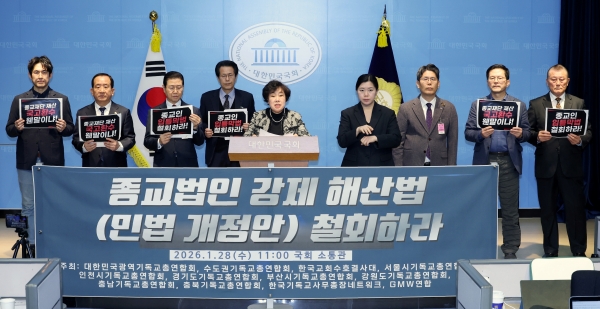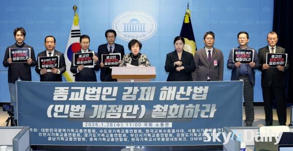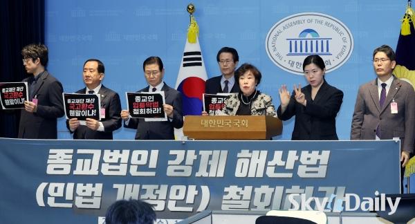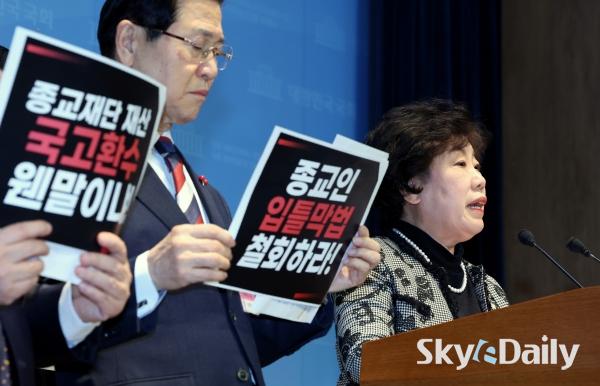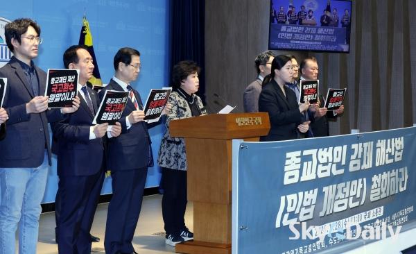 ¡ã Á¶¹è¼÷ ±¹¹ÎÀÇÈû ÀÇ¿ø°ú ´ëÇѹα¹±¤¿ª±âµ¶±³ÃÑ¿¬ÇÕȸ ȸ¿øµéÀÌ 28ÀÏ ±¹È¸ ¼ÒÅë°ü¿¡¼ ¿¸° ¡®Á¾±³¹ýÀÎ °Á¦ ÇØ»ê¹ý öȸ Ã˱¸ ±âÀÚȸ°ß¡¯À» Çϰí ÀÖ´Ù. ¹Ú¹Ì³ª ±âÀÚ ¨Ï½ºÄ«À̵¥Àϸ®