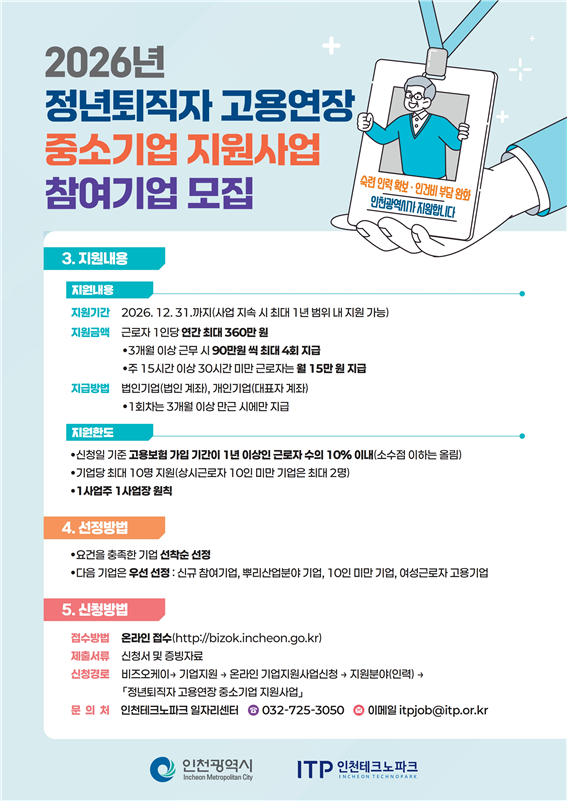 ¡ã ÀÎõ±¤¿ª½Ã°¡ 2026³â Á¤³âÅðÁ÷ÀÚ °í¿ë¿¬Àå Âü¿©±â¾÷À» ¸ðÁýÇÑ´Ù. ÀÎõ±¤¿ª½Ã