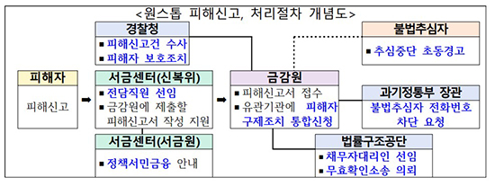 Á¤ºÎ°¡ ºÒ¹ý»ç±ÝÀ¶ ÇÇÇØÀÚ¸¦ À§ÇÑ ¡®¿ø½ºÅ顯 Áö¿øÃ¼°è¸¦ °¡µ¿ÇÑ´Ù. ÇÇÇØÀÚ°¡ ¿©·¯ ±â°üÀ» ÀüÀüÇÏÁö ¾Êµµ·Ï ½Å°í Á¢¼öºÎÅÍ ¼ö»ç ÀÇ·Ú, Ãß½ÉÁß´Ü, ÀüȹøÈ£ Â÷´Ü, ¹ý·üÁö¿ø, Á¤Ã¥¼¹Î±ÝÀ¶ ¾È³»¸¦ ÇÑ ¹ø¿¡ ¿¬°áÇÏ´Â ¹æ½ÄÀÌ´Ù.