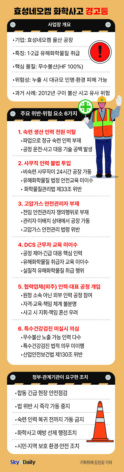 1¡¤2±Þ À¯ÇØÈÇй°ÁúÀ» Ãë±ÞÇÏ´Â È¿¼º³×¿ÀÄÍ »ç¾÷Àå¿¡¼ ´ëÇü ÈÇлç°í ¿ì·Á°¡ Á¦±âµÆ´Ù. ³«µ¿°À¯¿ªÈ¯°æÃ» Á¡°Ë °á°ú, ÆÄ¾÷À¸·Î ¼÷·ÃµÈ »ý»ê ÀηÂÀÌ Àü¿ø ÀÌÅ»ÇÑ »óȲ¿¡¼ ºñ¼÷·Ã »ç¹«Á÷°ú Çù·Â¾÷ü ÀηÂÀÌ °íÀ§Çè °øÁ¤¿¡ ÅõÀÔµÈ »ç½ÇÀÌ È®ÀεƴÙ. À̵éÀº À¯ÇØÈÇй°Áú ¾ÈÀü±³À°°ú Ư¼ö°Ç°°ËÁøÀ» ¹ÞÁö ¾ÊÀº °ÍÀ¸·Î ³ªÅ¸³µ´Ù. ȯ°æÃ»Àº Çö »óÅÂÀÇ °øÀå °¡µ¿ÀÌ Áß´ëÇÑ ÈÇлç°í·Î À̾îÁú °¡´É¼ºÀÌ ³ô´Ù¸ç Áï°¢ÀûÀÎ ¾ÈÀüÁ¶Ä¡¿Í °¡µ¿ Áß´ÜÀ» °ËÅäÇØ¾ß ÇÑ´Ù°í °æ°íÇß´Ù.