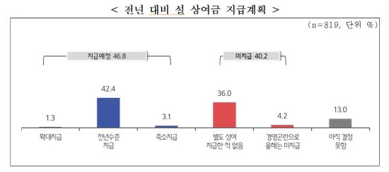 °÷°£ ºÎÁ·¿¡ ¼³ »ó¿©±Ý(Çö±Ý)µµ ±â¾÷ÀÇ Àý¹Ý¸¸ÀÌ Áö±ÞÇÑ´Ù. 46.8%°¡ ¡®Áö±Þ¿¹Á¤¡¯, 40.2%°¡ ¡®¹ÌÁö±Þ¡¯, 13.0%°¡ ¡®¾ÆÁ÷ °áÁ¤ ¸øÇß´Ù¡¯´Â ´äÀ» ³»³ù´Ù.