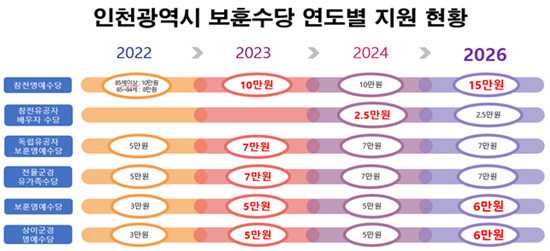 2023³âµµ¿¡´Â ÂüÀüÀ¯°øÀÚ Áß ¿¬·É¿¡ µû¶ó Â÷µî Áö¿øµÇ´ø ¡®ÂüÁ¤¸í¿¹¼ö´ç¡¯À» 65¼¼ ÀÌ»ó ´ë»óÀÚ ¸ðµÎ¿¡°Ô ¿ù 8¸¸ ¿ø¿¡¼ 10¸¸ ¿øÀ¸·Î È®´ë Áö¿øÇßÀ¸¸ç ¡®µ¶¸³À¯°øÀÚ º¸ÈÆ¸í¿¹¼ö´ç¡¯°ú ¡®Àü¸ô±º°æ À¯°¡Á·¼ö´ç¡¯À» ¿ù 5¸¸ ¿ø¿¡¼ 7¸¸ ¿øÀ¸·Î, ¡®º¸ÈÆ¿¹¿ì¼ö´ç¡¯À» ¿ù 3¸¸ ¿ø¿¡¼ 5¸¸ ¿øÀ¸·Î °¢°¢ »óÇâÇß´Ù.