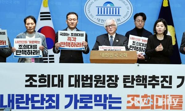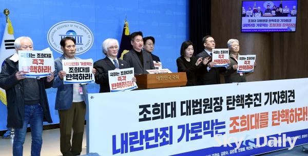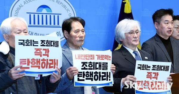 ¡ã 13ÀÏ ¿©Àǵµ ±¹È¸ ¼ÒÅë°ü¿¡¼ ÃÖÇõÁø ÀÇ¿ø(¹«¼Ò¼Ó ºñ·Ê´ëÇ¥)°ú ÃкÒÇൿÀÌ ±âÀÚȸ°ßÀ» ¿°í ¡®Á¶Èñ´ë źÇÙ¿¬´ë¡¯¸¦ °á¼ºÇØ Á¶ ´ë¹ý¿øÀå źÇÙÀ» ÃßÁøÇÏ°Ú´Ù°í °ø½Ä ¼±¾ðÇß´Ù. À̵éÀº ¡°ÃÖ±Ù »ç¹ýºÎÀÇ ¸ð½ÀÀ» ÁöÄѺ¸¸é¼ ³»¶õ¹ü À±¼®¿¿¡ ´ëÇØ¼µµ Á¶Èñ´ë »ç¹ýºÎ°¡ ¼Ø¹æ¸ÁÀÌ Ã³¹úÀ» ³»¸®Áö ¾ÊÀ»±î ¸¹Àº ±¹¹ÎµéÀÌ °ÆÁ¤Çϰí ÀÖ´Ù¡±¸ç ¡°³»¶õ ´ÜÁË °¡·Î¸·´Â Á¶Èñ´ë »ç¹ýºÎ¸¦ źÇÙÀ¸·Î ÀÀ¡Çϰڴ١±°í ¹àÇû´Ù. ¹Ú¹Ì³ª ±âÀÚ ¨Ï½ºÄ«À̵¥Àϸ®
