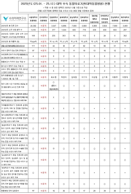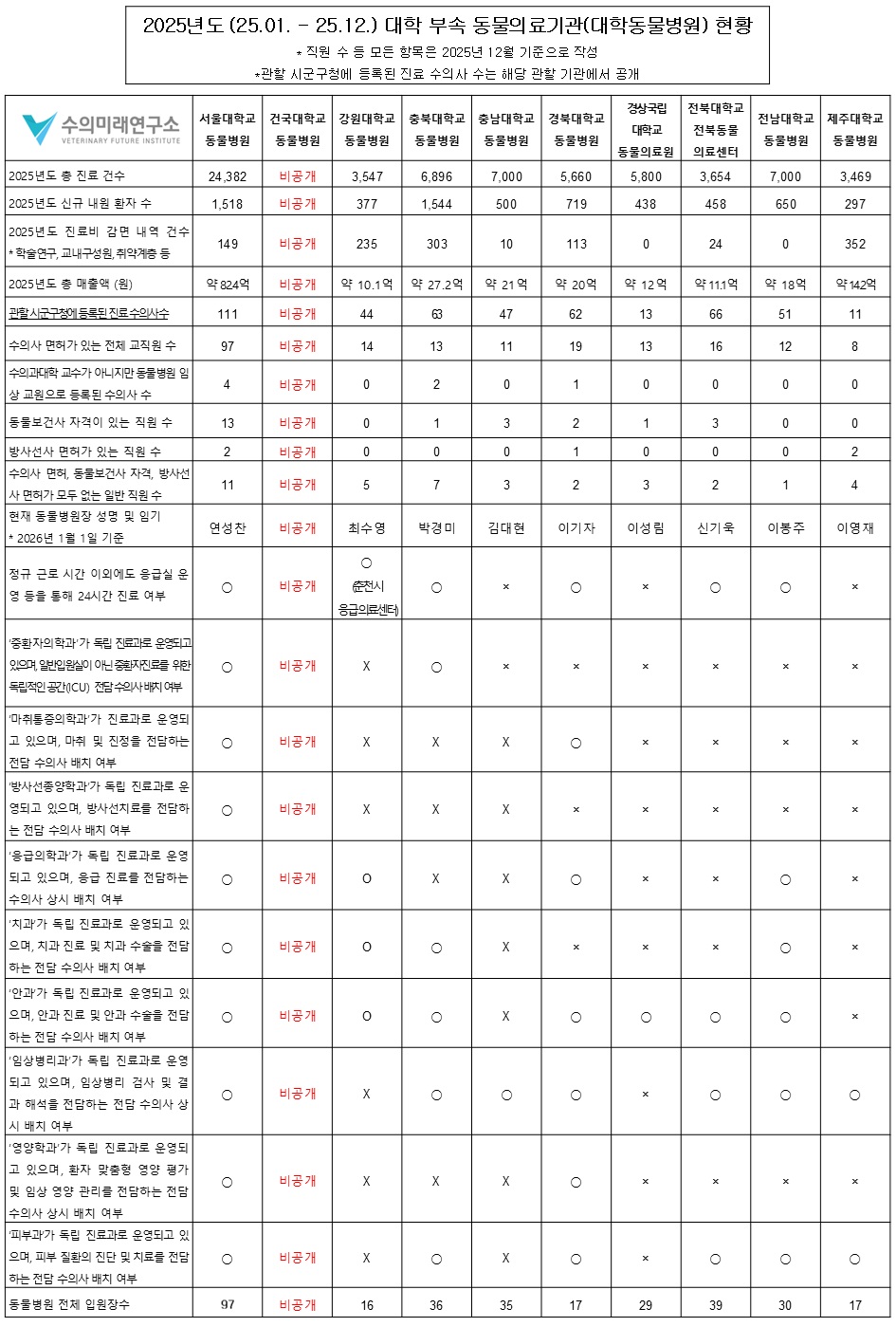 À̹ø Á¶»ç¿¡¼ À¯ÀÏÇÑ »ç¸³´ëÇб³ÀÎ °Ç±¹´ëÇб³ µ¿¹°º´¿øÀº Áø·á °Ç¼ö, ¸ÅÃâ¾×, Àη ÇöȲ µî Á¤º¸°ø°³Ã»±¸ ´ë»ó ¸ðµç Ç׸ñÀ» ¡®ºñ°ø°³¡¯ ó¸®Çß´Ù.