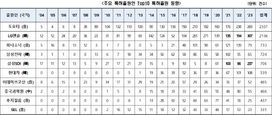 ´ÙÃâ¿øÀÎ ¼øÀ§·Î´Â µµ¿äŸ(2,337°Ç)°¡ 1À§¸¦ Â÷ÁöÇÑ °¡¿îµ¥ Çѱ¹±â¾÷À¸·Î´Â LG¿¡³ÊÁö¼Ö·ç¼Ç(2,136°Ç, 2À§), »ï¼ºÀüÀÚ(724°Ç, 4À§), »ï¼ºSDI(706°Ç, 5À§), Çö´ëÀÚµ¿Â÷(539°Ç, 6À§) µî 4°³ ±â¾÷ÀÌ »óÀ§ 10°³ ´ÙÃâ¿øÀο¡ Æ÷ÁøÇß´Ù.
