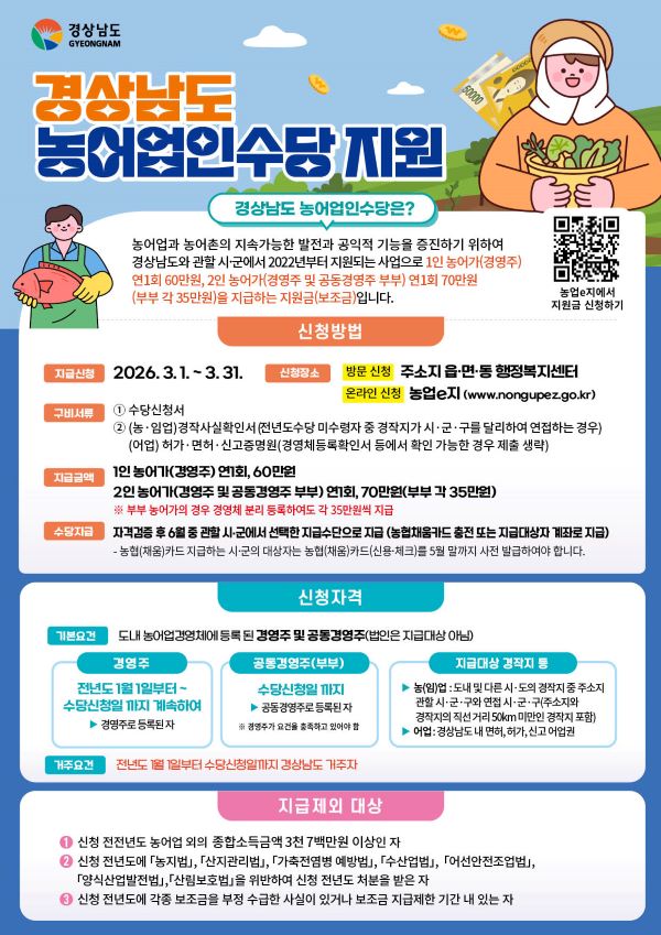 Áö±Þ ´ë»óÀº 2025³â 1¿ù1ÀϺÎÅÍ µµ³»¿¡ Áֹεî·ÏÀ» µÎ°í ³ó¾î¾÷°æ¿µÃ¼ µî·ÏÀ» À¯ÁöÇÏ¸é¼ ½ÇÁ¦ ³ó¾î¾÷¿¡ Á¾»çÇÏ´Â °æ¿µÁÖÀÌ´Ù. °øµ¿°æ¿µÁÖ´Â ºÎºÎ¿¡ ÇÑÇØ ÀÎÁ¤µÇ¸ç ¼ö´ç ½ÅûÀϱîÁö °øµ¿°æ¿µÁÖ·Î µî·ÏµÇ¾î ÀÖ¾î¾ß ÇÑ´Ù. ºÎºÎ ³ó¾î°¡°¡ °æ¿µÃ¼¸¦ °¢°¢ ºÐ¸® µî·ÏÇÑ °æ¿ì¿¡µµ °¢ 35¸¸ ¿ø¾¿ Áö±ÞµÈ´Ù.