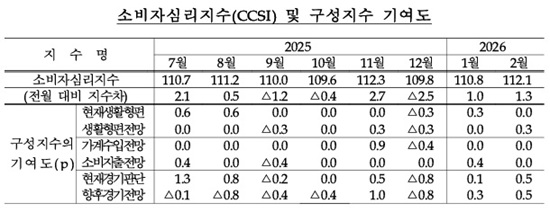 Çѱ¹ÀºÇàÀÌ 24ÀÏ ¹ßÇ¥ÇÑ ¡®2026³â 2¿ù ¼ÒºñÀÚµ¿ÇâÁ¶»ç °á°ú¡¯¿¡ µû¸£¸é 2¿ù ¼ÒºñÀڽɸ®Áö¼ö(CCSI)´Â 112.1·Î Àü¿ù ´ëºñ 1.3p »ó½ÂÇß´Ù. Áö¼ö´Â Áö³ÇØ 12¿ù 109.8·Î Ç϶ôÇÑ ÀÌÈÄ 1¿ù 110.8, 2¿ù 112.1·Î µÎ ´Þ ¿¬¼Ó »ó½ÂÇß´Ù.