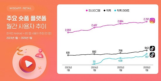 24ÀÏ ¾Û¡¤°áÁ¦ µ¥ÀÌÅÍ ºÐ¼®±â¾÷ ¿ÍÀÌÁî¾Û¡¤¸®Å×ÀÏÀÌ 2023³â 1¿ùºÎÅÍ 2026³â 1¿ù±îÁö Çѱ¹ÀÎ ½º¸¶Æ®Æù »ç¿ëÀÚ¸¦ Ç¥º» Á¶»çÇÑ °á°ú ¿ÃÇØ 1¿ù ±âÁØ ¼ôÆûÇü SNS Ç÷§ÆûÀÎ ÀνºÅ¸±×·¥ ¾Û ¿ù°£ »ç¿ëÀÚ´Â 2797¸¸ ¸íÀ¸·Î Áý°èµÆ´Ù. ÀÌ´Â 2025³â 1¿ù 2664¸¸ ¸í¿¡ ºñÇØ 5% Áõ°¡ÇÑ ¼öÄ¡·Î, ¿ª´ë ÃÖ´ë´Ù.
