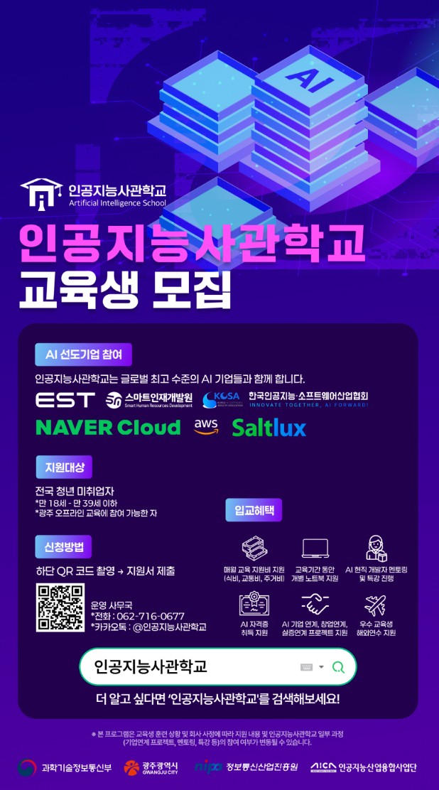 ±¤ÁÖ½Ã¿Í ±¤ÁÖAI»ç°üÇб³´Â Á¦7±â AI»ç°üÇб³ ±³À°»ý 220¸íÀ» 3¿ù31ÀϱîÁö ¸ðÁýÇÑ´Ù. À̹ø¿¡ ¸ðÁýÇÏ´Â 7±â´Â ±³À° ü°è¿Í ÅõÀÚ ±¸Á¶¸¦ Àü¸é °³ÆíÇÑ ¡®AI ÃÖ°í±Þ °úÁ¤¡¯À¸·Î ¿î¿µµÈ´Ù.