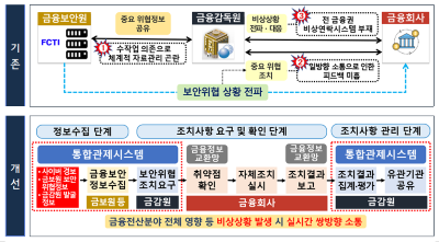 ÀÌ¿¡ ±Ý°¨¿øÀº »çÀ̹ö À§Çù Á¤º¸ÀÇ ½Å¼ÓÇÑ ¼öÁý¡¤°ü¸®, ±ÝÀ¶±Ç Àû½Ã ÀüÆÄ ¹× ¼±Á¦ ´ëÀÀ µîÀ» À§ÇÑ ¡®ÅëÇÕ°üÁ¦½Ã½ºÅÛ¡¯ ±¸Ãà¿¡ ³ª¼¹´Ù. ÀÌ·¯ÇÑ ÀÛ¾÷ÀÇ ÀÏȯÀ¸·Î Áö³ÇØ 5¿ù¿¡´Â ±ÝÀ¶º¸¾È¿ø°ú »çÀ̹öº¸¾È À§Çù Á¤º¸ °øÀ¯Ã¼°è ¸¶·Ã µîÀ» ³»¿ëÀ¸·Î ÇÏ´Â ¾÷¹«Çù¾à(MOU)À» ü°áÇß´Ù.