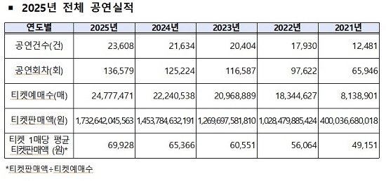 11ÀÏ ¹®È­Ã¼À°°ü±¤ºÎ¿Í ¿¹¼ú°æ¿µÁö¿ø¼¾ÅͰ¡ ¹ßÇ¥ÇÑ '2025³â °ø¿¬½ÃÀå Æ¼ÄÏ ÆÇ¸Å ÇöȲ ºÐ¼® º¸°í¼­'¿¡ µû¸£¸é, Áö³­ÇØ °ø¿¬ °ü¶÷±Ç ÃÑ ÆÇ¸Å¾×Àº 1Á¶7326¾ï ¿øÀ¸·Î, Àü³â(1Á¶ 4589¾ï ¿ø) ´ëºñ 18.8% Áõ°¡Çß´Ù°ø¿¬ °Ç¼ö(2¸¸3608°Ç)´Â 9.6%, °ø¿¬ ȸÂ÷(13¸¸6579ȸ)´Â 11.3%, ÃÑ °ü¶÷±Ç ¿¹¸Å ¼ö(2478¸¸ ¸Å)´Â 10.8% Áõ°¡Çϴ µî ¸ðµç ÁöÇ¥¿¡¼­ »ó½Â¼¼¸¦ ³ªÅ¸³Â´Ù. ´Ù¸¸, °ü¶÷±Ç 1¸Å´ç Æò±Õ °¡°Ýµµ Àü³â´ëºñ ¾à 5000¿ø »ó½ÂÇÑ 6¸¸9928¿øÀ¸·Î ³ªÅ¸³ª °ü¶÷°´ÀÇ ºñ¿ë ºÎ´ãµµ ´Ã¾ú´Ù.