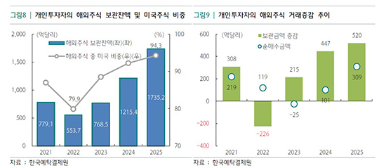 ÇØ¿ÜÁÖ½Ä ¼±È£µµµµ ´õ °ÇØÁú °ÍÀ¸·Î Àü¸ÁÇß´Ù. º¸°í¼¿¡ µû¸£¸é À۳⠸» ±âÁØ °³ÀÎÅõÀÚÀÚÀÇ ÇØ¿ÜÁÖ½Ä º¸°üÀܾ×Àº 1735¾ï´Þ·¯·Î ´Ã¾ú°í ÀÌ °¡¿îµ¥ ¹Ì±¹ÁÖ½Ä ºñÁßÀº 94.3%¿¡ ´ÞÇß´Ù. ¿¬±¸¼Ò´Â ¹Ì±¹ Áõ½Ã¿¡ ´ëÇÑ ³ôÀº ±â´ë¼öÀÍ·ü°ú ÅõÀÚ ÆíÀǼº, ±Û·Î¹ú AI »ê¾÷ ÁÖµµ·ÂÀ» °¨¾ÈÇÒ ¶§ ¹Ì±¹ÁÖ½Ä ¼ø¸Å¼ö È帧ÀÌ °è¼Ó À̾îÁú °¡´É¼ºÀÌ ³ô´Ù°í Æò°¡Çß´Ù.