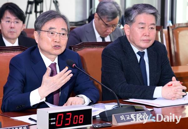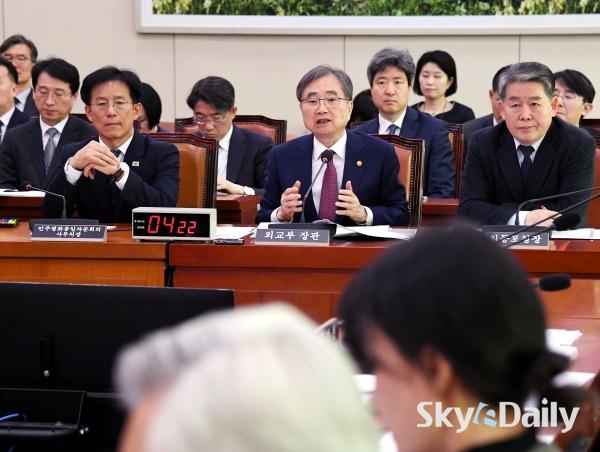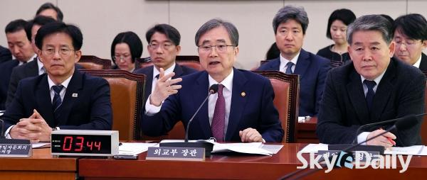 ¡ã Á¶Çö ¿Ü±³ºÎ Àå°üÀÌ 17ÀÏ ±¹È¸¿¡¼­ ¿­¸° ¿Ü±³ÅëÀÏÀ§¿øÈ¸ ÀüüȸÀÇ¿¡¼­ ÀÇ¿ø ÁúÀÇ¿¡ ´äÇϰí ÀÖ´Ù. ±¹È¸´Â À̳¯ ¿­¸° Áßµ¿ »çÅÂ¿Í °ü·ÃÇÑ ±ä±Þ Çö¾È ÁúÀÇ¿¡¼­ Çѱ¹ ÆÄº´ ¿äû ¹®Á¦ µî¿¡ °üÇÑ Á¤ºÎÀÇ ½ÅÁßÇÑ ´ëó¸¦ ÁÖ¹®Çß´Ù. ¹Ú¹Ì³ª ±âÀÚ ¨Ï½ºÄ«À̵¥Àϸ®