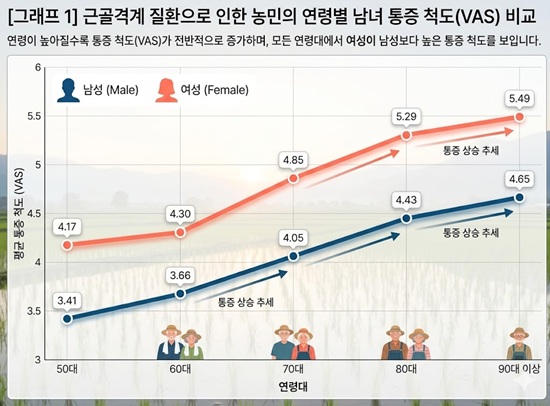 ¿¬¼¼´ëÇб³ ½ºÆ÷Ã÷ÀçȰ¿¬±¸¼Ò´Â ³ó¸²Ãà»ê½ÄǰºÎ¡¤³óÇùÁß¾Óȸ¿Í ÇÔ²² ¡®2025³â ³óÃÌ ¿ÕÁø¹ö½º¡¯ »ç¾÷À» ÅëÇØ Àü±¹ 20´ëºÎÅÍ 90´ë ÀÌ»ó ³ó¹Î 1¸¸656¸íÀ» Á¶»çÇÑ °á°ú, 79.6%°¡ Çϳª ÀÌ»óÀÇ ±Ù°ñ°Ý°è ÁúȯÀ» ¾Î°í ÀÖ¾ú´Ù°í ¹àÇû´Ù. ¿©¼º À¯º´·üÀº 83.1%·Î ³²¼º 72.8%º¸´Ù ³ô¾Ò°í, ÅëÁõ ôµµ(VAS)´Â ¿©¼º 4.8, ³²¼º 4.0À¸·Î Áý°èµÆ´Ù.