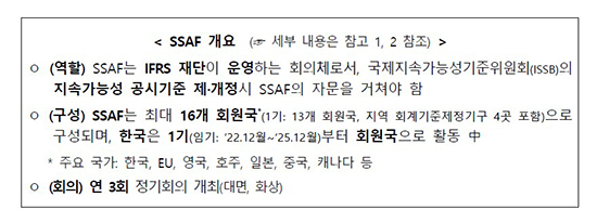 SSAF´Â ISSBÀÇ °ø½Ä ÀÚ¹®±â±¸´Ù. ISSB°¡ Áö¼Ó°¡´É¼º °ø½Ã±âÁØÀ» ¸¸µé°Å³ª °íÄ¥ ¶§ ±â¼úÀû ÀÚ¹®À» Á¦°øÇϰí, °¢±¹ÀÇ Á¦µµ ÀÌÇà °æÇè°ú Á¤Ã¥¡¤½ÃÀå ¿©°ÇÀÌ ±âÁØ ³íÀÇ¿¡ ¹Ý¿µµÇµµ·Ï Áö¿øÇÏ´Â ¿ªÇÒÀ» ¸Ã´Â´Ù. IFRS Àç´ÜÀÌ ¿î¿µÇϸç ISSB´Â ±âÁØ Á¦¡¤°³Á¤ °úÁ¤¿¡¼­ SSAFÀÇ ÀÚ¹®À» ÇʼöÀûÀ¸·Î °ÅÃÄ¾ß ÇÑ´Ù.