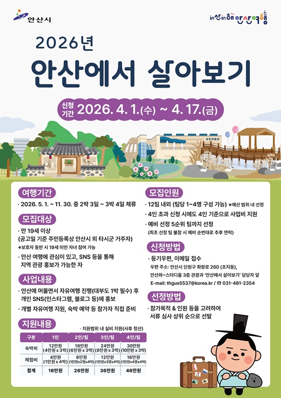 ¡®¾È»ê¿¡¼ »ì¾Æº¸±â¡¯´Â 3¹Ú4ÀÏ µ¿¾È ¾È»ê Àü¿ªÀ» ÀÚÀ¯·Ó°Ô ¿©ÇàÇÏ¸ç »çȸ°ü°è¸Á(SNS)À» ÅëÇØ Áö¿ªÀ» È«º¸Çϴ üÇèÇü °ü±¤ ÇÁ·Î±×·¥ÀÌ´Ù. ±âÁ¸ ¡®´ëºÎµµ¿¡¼ 3¹Ú4ÀÏ »ì¾Æº¸±â¡¯¸¦ ¾È»ê Àü¿ªÀ¸·Î È®´ë °³ÆíÇØ ¿î¿µÇÑ´Ù.