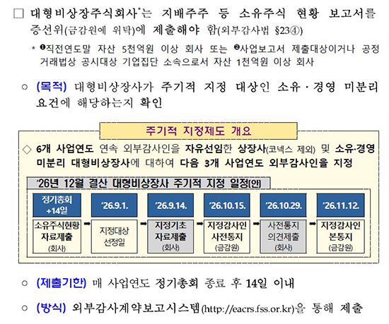 ¼ÒÀ¯¡¤°æ¿µ ¹ÌºÐ¸® ±âÁØ¿¡ ÇØ´çÇÏ´Â ´ëÇüºñ»óÀå»ç´Â Ãß°¡ Àǹ«µµ »ý±ä´Ù. ±Ý°¨¿øÀº ÀÌ·± ȸ»ç°¡ °¨»çÀÎ ÁöÁ¤ ±âÃÊÀÚ·á½Å°í¼µµ º°µµ·Î Á¦ÃâÇØ¾ß ÇÑ´Ù°í ¾È³»Çß´Ù. 12¿ù °á»ê¹ýÀÎÀÇ °æ¿ì Á¦Ãâ ½ÃÇÑÀº 9¿ù14ÀϱîÁö´Ù. ±Ý°¨¿øÀº ¡°ÁöÁ¤´ë»ó ¼±Á¤ÀÏ ÀÌÀü¿¡ ¼ÒÀ¯¡¤°æ¿µ ¹ÌºÐ¸® »óŰ¡ ÇØ¼ÒµÆ´õ¶óµµ ÀÌ ½Å°í¼´Â Á¦ÃâÇØ¾ß ÇÑ´Ù¡±°í ¼³¸íÇß´Ù.