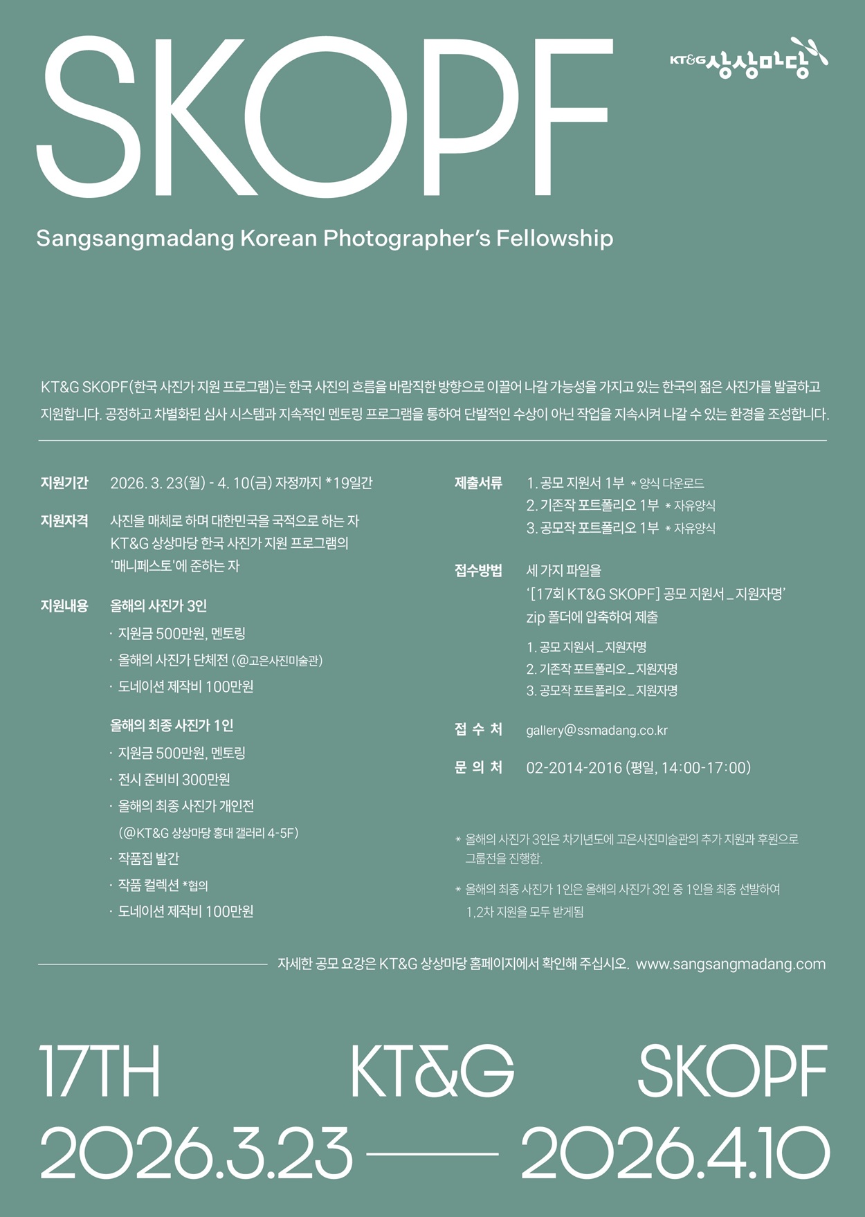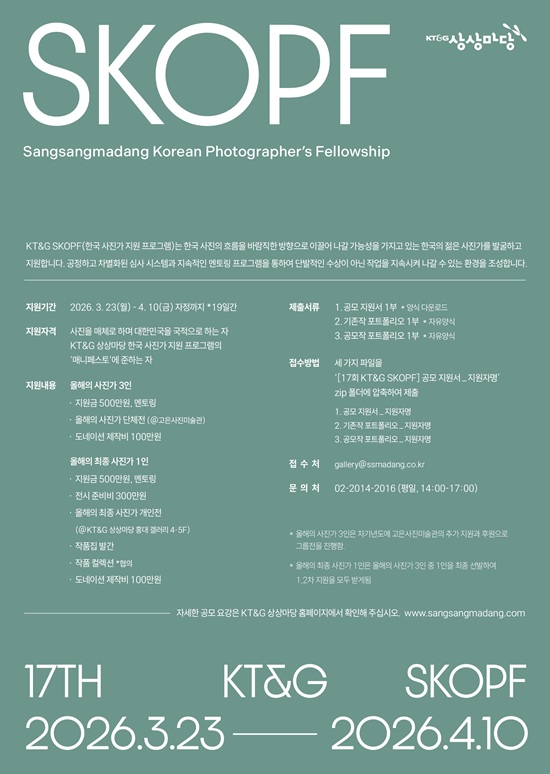 KT&G(»çÀå ¹æ°æ¸¸) »ó»ó¸¶´çÀÌ Çѱ¹»çÁø°¡ Áö¿ø ÇÁ·Î±×·¥ ¡®Á¦17ȸ KT&G SKOPF(Sangsangmadang Korean Photographer¡¯s Fellowship)¡¯ Âü°¡ÀÚ¸¦ ¿À´Â 10ÀϱîÁö ¸ðÁýÇÑ´Ù.