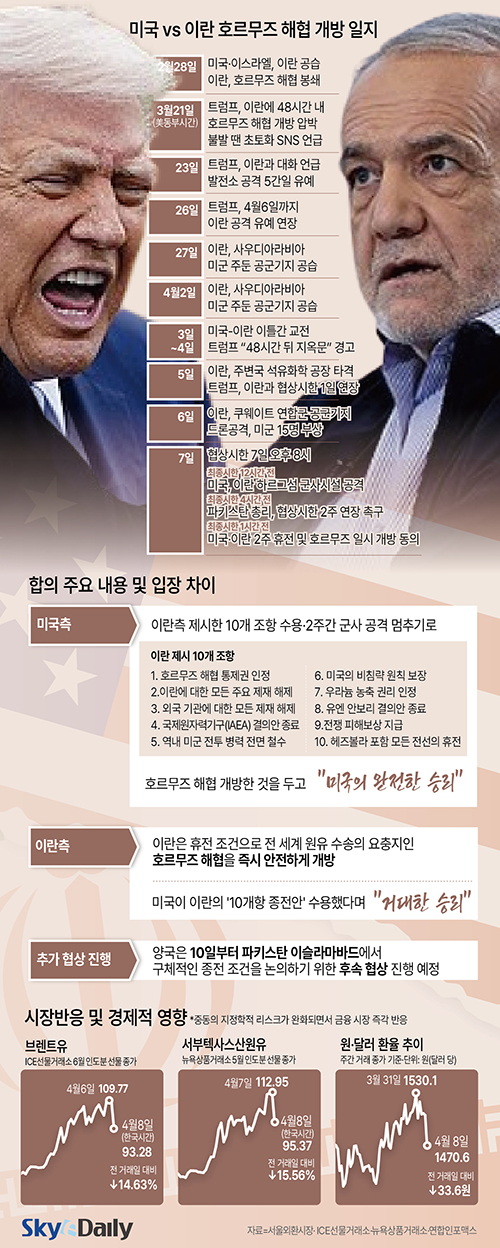 ¹Ì±¹°ú À̶õÀÌ 8ÀÏ 2ÁÖ°£ÀÇ ÀϽÃÀû ÈÞÀü¿¡ Àü°Ý ÇÕÀÇÇß´Ù. Çù»ó ½ÃÇÑ Á÷Àü ÆÄŰ½ºÅºÀÇ ÁßÀç·Î ±ØÀûÀ¸·Î Ÿ°áµÆ´Ù. ¹Ì±¹Àº ±º»ç °ø°ÝÀ» Áß´ÜÇϰí, À̶õÀº ¿øÀ¯ ¼ö¼Û ÇÙ½É Åë·ÎÀΠȣ¸£¹«Áî ÇØÇùÀ» Áï½Ã °³¹æÇϱâ·Î Çß´Ù. ¾çÃøÀº °¢°¢ ¡®¿Ïº®ÇÑ ½Â¸®¡¯¶ó°í Æò°¡ÇÏ¸ç ½Å°æÀüÀ» À̾°í ÀÖÀ¸¸ç, 10ÀϺÎÅÍ À̽½¶ó¸¶¹Ùµå¿¡¼ ÈÄ¼Ó Çù»óÀ» ÁøÇàÇÑ´Ù. ÈÞÀü ¼Ò½Ä¿¡ ºê·»Æ®À¯´Â 14.6% ±Þ¶ôÇß°í, ¿ø¡¤´Þ·¯ ȯÀ²µµ 30% ÀÌ»ó ±Þ¶ôÇÏ¸ç ±Û·Î¹ú ±ÝÀ¶½ÃÀåÀº ¾Èµµ ºÐÀ§±â¸¦ º¸¿´´Ù.