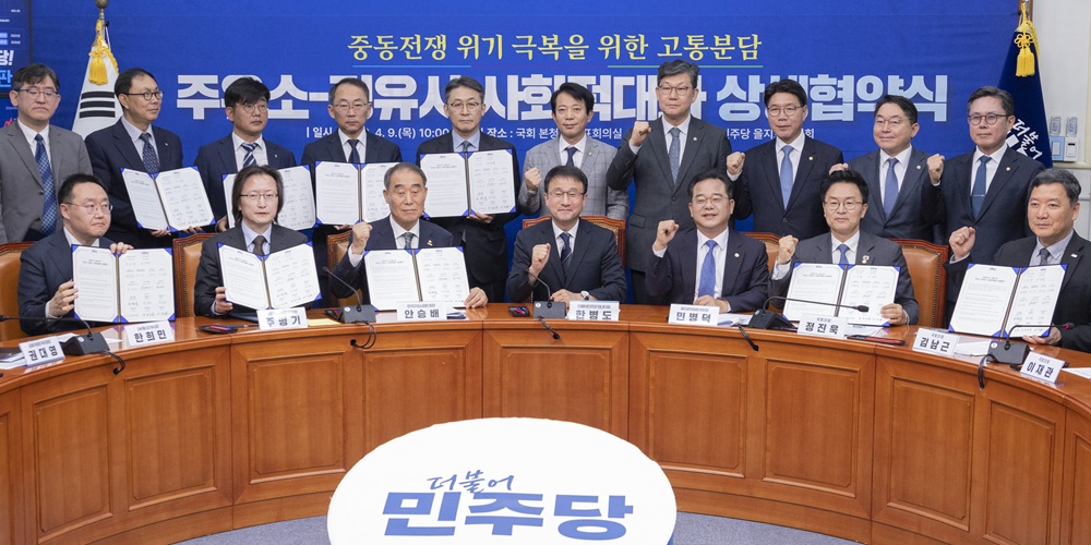 ¡ã 9ÀÏ ´õºÒ¾î¹ÎÁÖ´ç À»Áö·ÎÀ§¿øÈ¸ ÁÖÃÖ·Î ±¹È¸¿¡¼­ 'Áßµ¿ÀüÀï À§±â ±Øº¹À» À§ÇÑ °íÅë ºÐ´ã ÁÖÀ¯¼Ò-Á¤À¯»ç »çȸÀû´ëÈ­ »ó»ý Çù¾à½Ä'¿¡¼­ ÇѺ´µµ ¿ø³»´ëÇ¥(¾Æ·§ÁÙ ¿ÞÂÊ ³× ¹øÂ°)¿Í ¹Îº´´ö À»Áö·ÎÀ§¿øÈ¸ À§¿øÀå(¾Æ·§ÁÙ ¿ÞÂÊ ´Ù¼¸ ¹øÂ°)¸¦ ºñ·ÔÇÑ Á¤ºÎ¿Í Á¤À¯¾÷°è, ÁÖÀ¯¼Ò ¾÷°è °ü°èÀÚµé Çù¾à¼­¿¡ ¼­¸íÇÑ µÚ ±â³ä ÃÔ¿µÇϰí ÀÖ´Ù. À̳¯ ÁÖÀ¯¼Ò ¿¬ÇÕȸ¿Í 4°³ Á¤À¯»ç´Â ±âÁ¸ »óÇ¥ ÁÖÀ¯¼ÒÀÇ Àü¼Ó°è¾àÀ» ¿ÏÈ­Çϰí, Á¤À¯»ç´Â ÀÏÀÏ ÆÇ¸Å ±âÁذ¡°ÝÀ» »çÀü¿¡ È®Á¤¡¤°ø½ÃÇϵµ·Ï Çϰí, ±âÁ¸ »çÈÄÁ¤»êÁ¦´Â ÆóÁöÇÏ´Â »ó»ýÇù¾à¿¡ ¼­¸íÇß´Ù. ¿¬ÇÕ´º½º