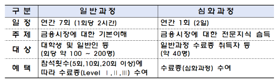 ÀϹݰúÁ¤Àº ±ÝÀ¶½ÃÀå¿¡ ´ëÇÑ ±âº» ÀÌÇØ¸¦ µ½´Â °úÁ¤À¸·Î, ¸Åȸ ¾à 100~200¸íÀ» ´ë»óÀ¸·Î ÇÑ´Ù. Âü¼® Ƚ¼ö°¡ 5ȸ, 10ȸ, 20ȸ ÀÌ»ó ½×ÀÏ ¶§¸¶´Ù °¢°¢ Level ¥°, ¥±, ¥² ¼ö·áÁõÀ» ¼ö¿©ÇÑ´Ù. ±Ý°¨¿ø °ü°èÀÚ´Â ¡°ÀϹݰúÁ¤Àº û³âÃþÀÇ °ÇÀüÇÑ ÅõÀÚ ½À°ü Çü¼º°ú ÀÚº»½ÃÀåÀ» ÅëÇÑ ÀÚ»ê Çü¼º¿¡ µµ¿òÀÌ µÇ´Â ÁÖÁ¦·Î ±¸¼ºµÈ´Ù¡±°í ¼³¸íÇß´Ù.