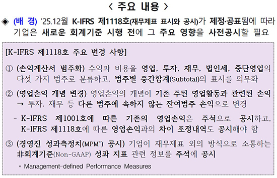»õ ±âÁØÀº ±â¾÷ÀÌ ÀÚÁÖ ¾²´Â ¡®Á¶Á¤¿µ¾÷ÀÌÀÍ¡¯À̳ª ¡®Á¶Á¤ EBITDA¡¯ °°Àº ºñȸ°è±âÁØ ¼º°úÁöÇ¥µµ ´õ Åõ¸íÇÏ°Ô °ø°³Çϵµ·Ï ÇÑ´Ù. ±Ý°¨¿ø¿¡ µû¸£¸é K-IFRS Á¦1118È£´Â ¡®°æ¿µÁøÀÌ Á¤ÀÇÇÑ ¼º°úÃøÁ¤Ä¡(MPM)¡¯ °ø½Ã¸¦ »õ·Î µµÀÔÇÑ´Ù.
