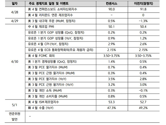 À̹ø ÁÖ¿¡´Â ¹Ì±¹ 4¿ù ¼ÒºñÀڽŷÚÁö¼ö, 3¿ù ³»±¸Àç ÁÖ¹®, Áß±¹ 4¿ù Á¦Á¶¾÷ PMI, À¯·ÎÁ¸ 1ºÐ±â ±¹³»ÃÑ»ý»ê(GDP) ¹× 4¿ù ¼ÒºñÀÚ¹°°¡, ¹Ì±¹ 1ºÐ±â ¼ºÀå·ü°ú 3¿ù °³ÀμҺñÁöÃâ(PCE) ¹°°¡µµ ¹ßÇ¥µÈ´Ù. ƯÈ÷ PCE ¹°°¡´Â ¿¬ÁØÀÇ ¹°°¡ ÆÇ´Ü¿¡ Á÷Á¢ ¿µÇâÀ» ÁÖ´Â ÁöÇ¥ÀÎ ¸¸Å FOMC ¸Þ½ÃÁö¿Í ¸Â¹°·Á ½ÃÀå º¯µ¿¼ºÀ» Ű¿ï ¼ö ÀÖ´Ù.