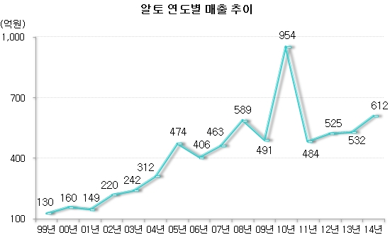 ÀÌó·³ GS±×·ìÀ» ºñ·ÔÇØ ¹üLGÊ« ±â¾÷µé¿¡°Ô ±îÁö ÀûÁö ¾ÊÀº Àϰ¨À» ¹Þ¾Æ ¿Â ¾ËÅäÀÇ ½ÇÀûÀº 2000³â´ë ÀÌÈÄ ²ÙÁØÈ÷ »ó½ÂÇß´Ù. ´Ù¸¸, °Ç¼³ °æ±â°¡ ¾ÇÈµÈ ÃÖ±Ù¿¡´Â ¾à°£ÀÇ Ç϶ô¼¼¸¦ °È°í ÀÖ´Â °ÍÀ¸·Î ³ªÅ¸³µ´Ù. °¨»çº¸°í¼¸¦ ù °ø½ÃÇÑ Áö³ 1999³â 130¾ï¿¡ ºÒ°úÇß´ø ¸ÅÃâ¾×Àº 2010³â 954¾ï¿øÀ¸·Î ¹«·Á 7¹è³ª Áõ°¡Çß´Ù.