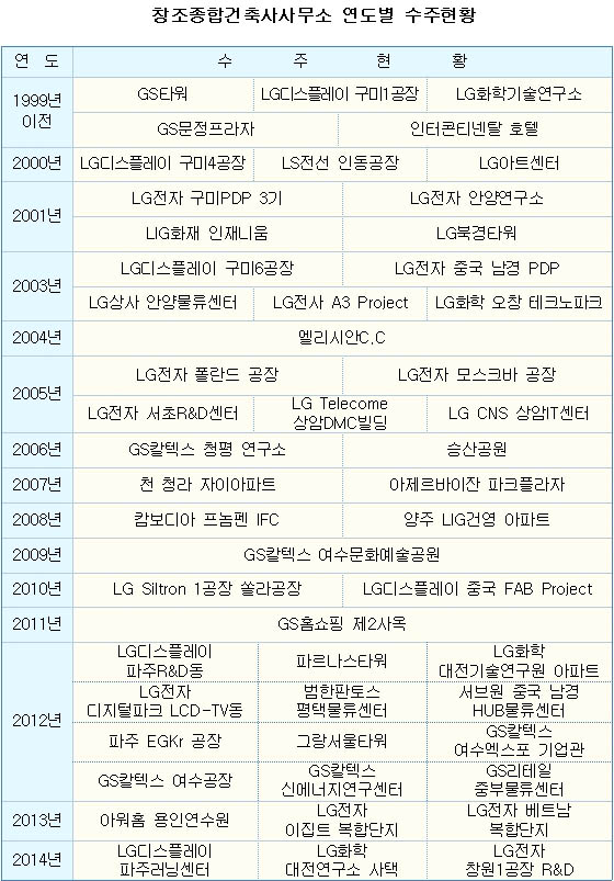 âÁ¶Á¾ÇÕ°ÇÃà»ç»ç¹«¼ÒÀÇ ¿¬µµº° ¼öÁÖ ÇöȲÀ» »ìÆìº¸¸é ¡â1999³â ÀÌÀü GSŸ¿ö, LGµð½ºÇ÷¹ÀÌ ±¸¹Ì1°øÀå, LGÈÇбâ¼ú¿¬±¸¼Ò, GS¹®Á¤ÇÁ¶óÀÚ, ÀÎÅÍÄÜÆ¼³ÙÅ» È£ÅÚ ¡â2000³â LGµð½ºÇ÷¹ÀÌ ±¸¹Ì4°øÀå, LSÀü¼± Àε¿°øÀå, LG¾ÆÆ®¼¾ÅÍ ¡â2001³â LGÀüÀÚ ±¸¹ÌPDP 3±â, LGÀüÀÚ ¾È¾ç¿¬±¸¼Ò, LIGÈÀç ÀÎÀç´Ï¿ò, LGºÏ°æÅ¸¿ö ¡â2003³â LGµð½ºÇ÷¹ÀÌ ±¸¹Ì6°øÀå, LGÀüÀÚ Áß±¹ ³²°æ PDP, LG»ó»ç ¾È¾ç¹°·ù¼¾ÅÍ, LGÀü»ç A3 Project, LGÈÇÐ ¿Àâ Å×Å©³ëÆÄÅ© µîÀ̾ú´Ù.