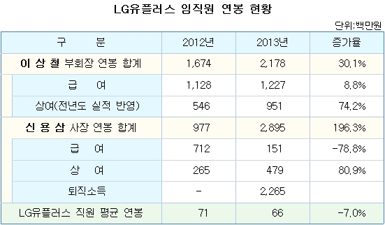 ´õ¿íÀÌ Áö³ÇØ ÀÌ ºÎȸÀåÀÌ Ã¬±ä ±âº»±Þ°ú »ó¿©±Þ µîÀº ¸ðµÎ Àü³â°ú ºñ±³ÇØ ³ôÀº ¼öÁØÀ» ³ªÅ¸³½ ¹Ý¸é LGÀ¯Ç÷¯½º Á÷¿øµéÀÇ Æò±Õ ¿¬ºÀÀº µÇ·¹ °¨¼ÒÇÑ °ÍÀ¸·Î ¹àÇôÁ® ³í¶õÀº ´õ¿í ÁõÆøµÇ°í ÀÖ´Ù. ÀÌ ºÎȸÀåÀº ÀÏ¹Ý Á÷¿øµé°ú ´Þ¸® ½ÇÀû°ú °¢Á¾ ±¸¼³¼ö ¼Ó¿¡¼µµ ¿ÀÈ÷·Á ´õ¿í ±»°ÇÇÑ Ã¶¹äÅëÀÇ ¸é¸ð¸¦ º¸À̰í ÀÖ´Ù´Â °Ô LGÀ¯Ç÷¯½º ¾ÈÆÆÀÇ ½Ã°¢ÀÌ´Ù.