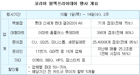 ¡ã Á¤ºÎ°¡ ¼öÃâºÎÁøÀ¸·Î ħüµÈ °æ±âȸº¹À» À§ÇØ ¼±ÅÃÇÑ ³»¼öȰ¼ºÈ Ä«µå·Î ¡®ÄÚ¸®¾Æ ºí·¢ÇÁ¶óÀ̵¥ÀÌ¡¯¸¦ ½Ç½ÃÇÑ´Ù. ³»´Þ 1ÀϺÎÅÍ 14ÀϱîÁö 2ÁÖ°£ ±¹³» ÃÖÃÊ¡¤ÃÖ´ë ÇÒÀÎÇà»ç¸¦ ½Ç½ÃÇÏ´Â °ÍÀÌ´Ù. ¹éÈÁ¡ºÎÅÍ ÀüÅë½ÃÀå±îÁö 2¸¸7000¿©°³ Á¡Æ÷°¡ À̹ø Çà»ç¿¡ µ¿ÂüÇÑ´Ù. »çÁøÀº ¿ÞÂʺÎÅÍ ½Ã°è¹æÇâÀ¸·Î ¹éÈÁ¡, ÀüÅë½ÃÀå, ´ëÇü¸¶Æ® ¨Ï½ºÄ«À̵¥Àϸ®