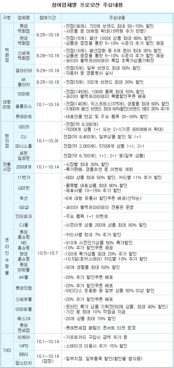 ÀÌÄɾÆ, BBQ, VIPS µî °¡±¸Àü¹®Á¡, ÇÁ·£Â÷ÀÌÁî, ÆÐ¹Ð¸®·¹½ºÅä¶û µîµµ À̹ø Çà»ç¿¡ Âü¿©Çϸç 16°³ ¿Â¶óÀÎ À¯Åë¾÷ü µîµµ Çà»ç±â°£µ¿¾È ´ë±Ô¸ð ÇÒÀÎÀüÀ» °³ÃÖÇÒ ¿¹Á¤À̶ó°í ¹àÇû´Ù. Ä«µå»çµéµµ µ¿ÂüÇÑ´Ù. Àü Ä«µå»ç´Â À̹ø Çà»ç¿¡ Âü¿©ÇÏ´Â ¾÷ü¸¦ ´ë»óÀ¸·Î ÃÖ´ë 5°³¿ùÀÇ ¹«ÀÌÀÚ ÇҺθ¦ ½Ç½ÃÇÏ°Ú´Ù°í ¹àÈù »óÅ´Ù.
