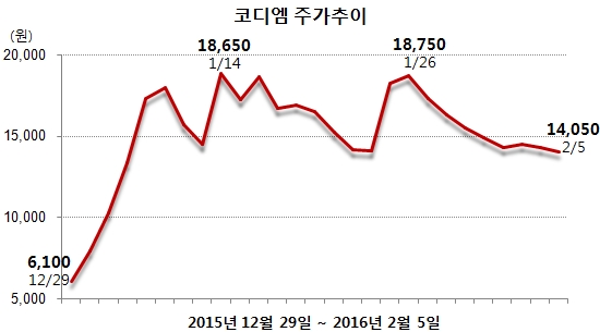 ÀÌ·± ÄÚµð¿¥Àº Áö³ÇØ 12¿ù 29ÀÏ ÄÚ½º´Ú ½ÃÀå¿¡ ÁÖ½ÄÀ» °ø°³ÇÏ¸ç »óÀå±â¾÷ÀÌ µÆ´Ù. »óÀå ÀÌÈÄ ÄÚµð¿¥ÀÇ ÁÖ°¡´Â ¿À¸£³»¸®±â¸¦ ¹Ýº¹Çϸ鼵µ °á°úÀûÀ¸·Î »ó´çÈ÷ ¿Ã¶ú´Ù. ÀÌ¿¡ Áõ±Ç°¡¿¡¼´Â ¡®»ï¼ºÀüÀÚ¡¯¶ó´Â źźÇÑ ¹è°æÀÌ ÀÛ¿ëÇÑ È¿°ú¶ó´Â ½Ã°¢ÀÌ Áö¹èÀûÀÌ´Ù.