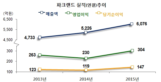 ±ÝÀ¶°¨µ¶¿ø ÀüÀÚ°ø½Ã½Ã½ºÅÛ¿¡ µû¸£¸é, Áö³ÇØ ¸» ±âÁØ ÆÄÅ©·£µå ¿¬°á ½ÇÀûÇöȲÀº ¡ã2013³â ¸ÅÃâ¾× 4733¾ï¿ø, ¿µ¾÷ÀÌÀÍ 263¾ï¿ø, ´ç±â¼øÀÌÀÍ 123¾ï¿ø ¡ã2014³â ¸ÅÃâ¾× 5226¾ï¿ø, ¿µ¾÷ÀÌÀÍ 230¾ï¿ø, ´ç±â¼øÀÌÀÍ 119¾ï¿ø ¡ã2015³â ¸ÅÃâ¾× 6076¾ï¿ø, ¿µ¾÷ÀÌÀÍ 304¾ï¿ø, ´ç±â¼øÀÌÀÍ 147¾ï¿øÀÌ´Ù.