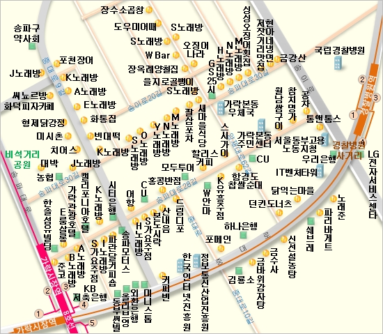 ¡ã ÁöÇÏö °¡¶ô½ÃÀ忪 3¹ø°ú 4¹ø Ãⱸ ¹æ¸éÀ¸·Î ¿ÀÇǽº»ó±ÇÀÌ Çü¼ºµÅ ÀÖ´Ù. ¸ÂÀº Æí¿¡´Â °¡¶ô½ÃÀå ½Ã¼³ Çö´ëÈ»ç¾÷ÀÌ ÇÑâÀÌ´Ù.(»çÁø À§). ¿ÀÇǽº»ó±ÇÀº ÁöÇÏö ¿ª¿¡¼ ±¹¸³°æÂûº´¿ø(»çÁø ¾Æ·¡)±îÁö °Å¸®»ó 1km°¡ ¾ÈµÇ´Â ³ÐÁö ¾ÊÀº Áö¿ª¿¡ ¿ÀÇǽº °Ç¹°ÀÌ ¹ÐÁýµÅ ÀÖÀ¸¸ç ´ë·Îº¯°ú À̸鵵·Î¸¦ µû¶ó »ó±ÇÀÌ ¸¸µé¾îÁ® ÀÖ´Ù.¨Ï½ºÄ«À̵¥Àϸ®