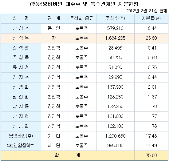 ±× ¿Ü¿¡µµ ¾à 10% °¡±î¿î ÁÖ½ÄÀ» ³² ȸÀåÀÇ Ä£¡¤ÀÎôµéÀÌ ÁÖ½ÄÀ» º¸À¯ÇØ (ÁÖ)³²¿µºñºñ¾ÈÀÇ 75.88%ÀÇ ÁÖ½ÄÀÌ °¡Á· ¸íÀÇ·Î µÅ ÀÖ´Ù.