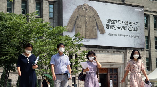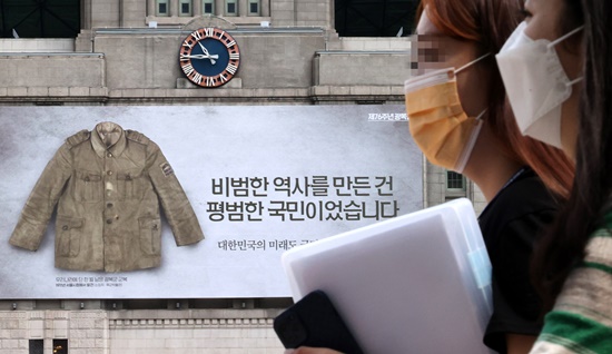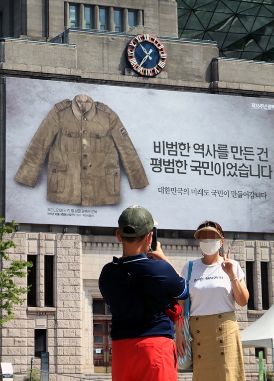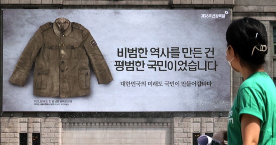 ¡ã Á¦76Áֳ⠱¤º¹Àý(15ÀÏ)À» ¾ÕµÐ 10ÀÏ ¼¿ï½Ãû ¾Õ ¼¿ïµµ¼°ü ¿Üº®¿¡ ±¤º¹±º ±ºº¹ »çÁø°ú ÇÔ²² ¡®ºñ¹üÇÑ ¿ª»ç¸¦ ¸¸µç °Ç, Æò¹üÇÑ ±¹¹ÎÀ̾ú½À´Ï´Ù. ´ëÇѹα¹ÀÇ ¹Ì·¡µµ ±¹¹ÎÀÌ ¸¸µé¾î°©´Ï´Ù¡¯¶ó´Â ¹®±¸°¡ ÀûÈù ±¤°í°¡ ³»°É·È´Ù. ±¤º¹ÀýÀ» ±â³äÇϱâ À§ÇÑ °Ô½Ã¹°ÀÌÁö¸¸ ÀûÈù ¹®±¸´Â Çö Á¤ºÎÀÇ ½ÇÁ¤À¸·Î °íÅë ¹Þ°í ÀÖ´Â ±¹¹ÎÀÇ ´ÙÁüÀ» ´ëº¯ÇÑ´Ù´Â Æò°¡¸¦ ¹Þ°í ÀÖ´Ù. »çÁøÀº ¼¿ïµµ¼°ü ¿Üº®¿¡ °É¸° Á¦76Áֳ⠱¤º¹Àý ±â³ä °Ô½Ã¹°ÀÇ ¸ð½À. [»çÁø=ÀÌÁ¾¿ø ´ë±âÀÚ] ¨Ï½ºÄ«À̵¥Àϸ®