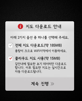 º¸Åë WifiÁö¿ª¿¡¼ ¸ÕÀú Áöµµ¸¦ ´Ù¿î¹Þ¾Æ¼ »ç¿ëÇÏ´Â °ÍÀÌ ÀϹÝÀûÀ̾úÁö¸¸ ÀÌÁ¦´Â ¾Û ¼³Ä¡ ½Ã 15MBÁ¤µµÀÇ Çʼö µ¥ÀÌÅ͸¸ ¹ÞÀ¸¸é ¹Ù·Î ±æ¾È³»¸¦ ¹ÞÀ» ¼ö ÀÖ´Ù. »Ó¸¸ ¾Æ´Ï¶ó, Ç×»ó ÃֽŹöÀüÀÇ Áöµµ¸¦ À¯ÁöÇÒ ¼ö Àֱ⠶§¹®¿¡ ¸Å¹ø Áöµµ ¹öÀüÀ» È®ÀÎÇÏ°í ¾÷µ¥ÀÌÆ®¹Þ¾Æ¾ß ÇÏ´Â ¹ø°Å·Î¿òµµ »ç¶óÁ³´Ù.