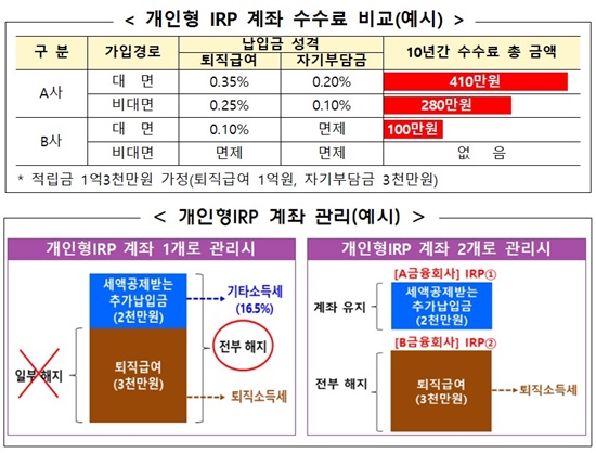 ±ÝÀ¶´ç±¹ÀÌ °³ÀÎÇü ÅðÁ÷¿¬±Ý(IRP) °èÁ¸¦ ¿Â¶óÀΡ¤¸ð¹ÙÀÏ µî ºñ´ë¸éÀ¸·Î ¸¸µé¸é ¼ö¼ö·á¸¦ ¸éÁ¦¹ÞÀ» ¼ö ÀÖ´Ù°í Á¶¾ðÇß´Ù. ¶Ç IRP¿¡¼ ÇâÈÄ ºÒ°¡ÇÇÇÑ ÀÚ±ÝÀÎÃâÀÌ ¿¹»óµÇ¸é ÅðÁ÷±Þ¿©¿Í º»ÀÎ Ãß°¡ ³³ÀÔ±ÝÀ» º°µµ·Î °ü¸®Ç϶ó°í ´çºÎÇß´Ù.