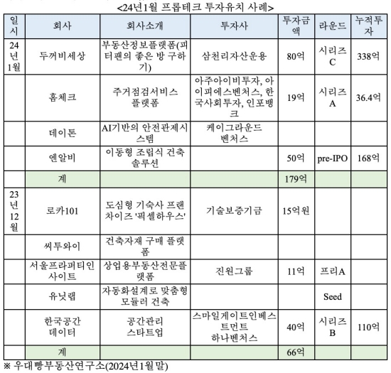 ¿ì´ë»§ºÎµ¿»ê¿¬±¸¼Ò´Â º¥Ã³ ÅõÀÚ»çÀÌÆ® ¹× ¾ð·Ð ¹ßÇ¥ µîÀ» Á¾ÇÕÇØ¼ ¸Å¿ù ÇÁ·ÓÅ×Å© ÅõÀÚÀ¯Ä¡ ½ÇÀûÀ» Áý°èÇϰí ÀÖ´Ù. 2024³â 1¿ù¿¡´Â ºÎµ¿»êÁ¤º¸ Ç÷§Æû ¡®µÎ²¨ºñ¼¼»ó¡¯°ú ÁÖ°ÅÁ¡°Ë ¼ºñ½º Ç÷§ÆûÀÎ ¡®È¨Ã¼Å©¡¯ ¹× À̵¿Çü Á¶¸³½Ä °ÇÃà¼Ö·ç¼Ç ±â¾÷ ¡®¿£¾Ëºñ¡¯°¡ ÅõÀÚ¸¦ À¯Ä¡Çß´Ù.