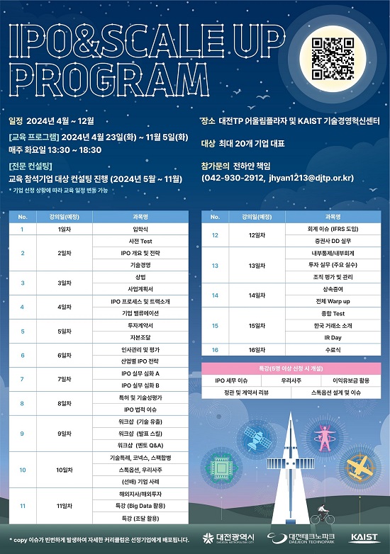 ´ëÀü±¤¿ª½Ã´Â ´ëÀüÅ×Å©³ëÆÄÅ©(´ëÀüTP)‧Ä«À̽ºÆ®(KAIST)¿Í ÇÔ²² ¼ºÀå ÀáÀç·ÂÀ» Áö´Ñ Áö¿ª À¯¸Á Áß¼Ò‧º¥Ã³±â¾÷À» ¹ß±¼ÇØ ÅõÀÚ À¯Ä¡ ¹× ÄÚ½º´Ú »óÀåÀ» ü°èÀûÀ¸·Î Áö¿øÇÏ´Â ¡®2024³â ±â¾÷ »óÀå(IPO) ÇÁ·Î±×·¥¡¯À» ¿î¿µÇϱâ·Î Çß´Ù°í 26ÀÏ ¹àÇû´Ù.