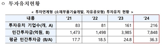 ƯÈ÷ ¿ÃÇØºÎÅÍ ¹Î°£ ÅõÀÚ±Ý 100¾ï ¿ø ÀÌ»óÀ» À¯Ä¡ÇÑ ±â¾÷¿¡ ´ëÇØ¼´Â Á¤ºÎµµ »ç¾÷È Áö¿ø ¿¬±¸°³¹ß(R&D)À» ´ëÆø Áõ¾×(ÃÖ´ë 25¾ï ¿ø¡æÃÖ´ë 50¾ï ¿ø)ÇÏ´Â º°µµ Æ®·¢À» ½Å¼³Çß´Ù. ±× °á°ú 24°³ ±â¾÷ÀÌ 100¾ï ¿ø ÀÌ»óÀÇ ´ë±Ô¸ð ÅõÀÚÀ¯Ä¡¸¦ ±â·ÏÇß°í ±× ±Ô¸ðµµ 3650¾ï ¿ø¿¡ ´ÞÇß´Ù. º°µµ Æ®·¢ ½Å¼³ ÀüÀÎ 2023³âµµ¿¡ ºñÇØ ±â¾÷ ¼ö´Â 8¹è(3¡æ24°³ »ç), ÅõÀÚÀ¯Ä¡±Ý¾×Àº 11¹è(330¡æ3650¾ï ¿ø) Áõ°¡ÇØ ½Å±Ô Æ®·¢ÀÌ ¹Î°£ÅõÀÚ¸¦ À¯ÀÎÇÏ´Â ÁÖ¿äÇÑ ¼ö´ÜÀÌ µÆ´Ù.