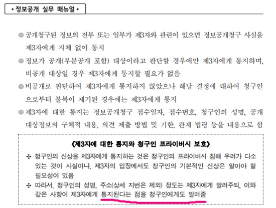 °³ÀÎÁ¤º¸º¸È£¹ý Á¦15Á¶¿Í ¹ý¹«ºÎÀÇ Á¤º¸°ø°³ ½Ç¹« ¸Å´º¾ó¿¡ ÀÇÇϸé Á¤º¸ ÁÖü¿¡°Ô ºÒÀÌÀÍÀÌ ¹ß»ýÇÏ´ÂÁöÀÇ ¿©ºÎ µîÀ» °í·ÁÇØ Á¤º¸ ÁÖü µ¿ÀÇ ¾øÀÌ °³ÀÎÁ¤º¸ Á¦°øÀ» ÇÒ ¼ö ¾ø°Ô²û µÅ ÀÖ´Ù. ¶ÇÇÑ Á¦»ïÀÚ¿¡°Ô Á¤º¸¸¦ °ø°³ÇÒ°æ¿ì û±¸Àο¡°Ôµµ À̸¦ ¹Ýµå½Ã ¾Ë·Á¾ß ÇÑ´Ù. Á¤ºÎÀÇ ¿¹Å¹°áÁ¦¿ø Á¤º¸°ø°³ ¾÷¹« ó¸® Áöħµµ ÀÌ °°Àº ³»¿ëÀ» Á¦4Ç× ¡®Á¤º¸°ø°³ û±¸¼ÀÇ Ã³¸®¡¯ Á¶Ç×ÀÇ ºÎÄ¢ 4¹ø°ú 5¹ø¿¡ ¡®º°Áö ¼½Ä¡¯¿¡ ±ÔÁ¤Çϰí ÀÖ´Ù.