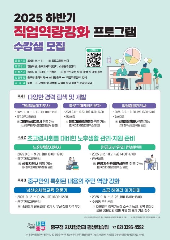 Ã롤â¾÷À» ÁغñÇÏ´Â ÁֺΡ¤ÀºÅð(¿¹Á¤)ÀÚ¡¤Á÷ÀåÀÎ µîÀ» ´ë»óÀ¸·Î ÇÑ´Ù. Á¤¿øÀº 165¸íÀ̸ç Áß±¸¹ÎÀ» ¿ì¼± ¼±¹ßÇÑ´Ù. ½ÅûÀº Áß±¸Ã» ȨÆäÀÌÁö(AI³»ÆíÁß±¸)¿¡¼ ÇÒ ¼ö ÀÖ´Ù. ¼ö°·á´Â Àü¾× ¹«·áÀÌ¸ç ±³Àçºñ¿Í Àç·áºñ, ÀÚ°ÝÁõ ¹ß±Þºñ¿ë¸¸ ¼ö°»ýÀÌ ºÎ´ãÇÑ´Ù.