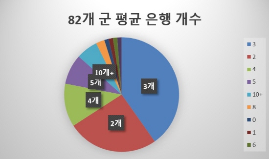 ´Ù¸¸ 10°³ ÀÌ»ó Á¡Æ÷¸¦ °¡Áø ±ºÀº 6°³ »ÓÀÌ´Ù. Àü±¹ 82°³ ±º °¡¿îµ¥ 40.4%¿¡ ´ÞÇÏ´Â 33°³ ±ºÀº ÀºÇà Á¡Æ÷°¡ 3°÷ ¼ÒÀçÇÑ´Ù. ÀÌ °æ¿ì ³óÇùÀºÇà°ú KB±¹¹ÎÀºÇà, ȤÀº ³óÇù°ú Áö¿ªÀºÇàÀÌ °æÀïÇÏ´Â ±¸µµ°¡ Çü¼ºµÈ´Ù. ¶Ç 2°³ Á¡Æ÷°¡ Á¸ÀçÇÏ´Â 21°³ ±º(25.6%)Àº ³óÇùÀºÇà ´Üµ¶À¸·Î Á¡Æ÷¸¦ ¿î¿µ ÁßÀÌ´Ù. 4°³ Á¡Æ÷°¡ ÀÖ´Â ±ºÀº 10°÷, 5°³ ÀÌ»ó Á¡Æ÷°¡ ÀÖ´Â ±ºÀº 7°÷ÀÌ´Ù.