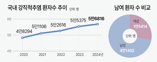 2024³â ±âÁØ ±¹³» °Á÷ôÃß¿° ȯÀÚÀÇ 33.6%´Â 20~40 ÀþÀº ÃþÀ¸·Î È®ÀεƴÙ. 40´ëÀÇ À¯º´·üÀÌ 28.0%·Î °¡Àå ³ô¾Ò´Ù. ¼ºº°·Î ³ª´ °æ¿ì ³²¼º ȯÀÚ ¼ö´Â 4¸¸¸íÀ» ¿ôµ¹°í ¿©¼ºÀÇ °æ¿ì 1¸¸5414¸íÀ¸·Î ³²¼º ȯÀÚ ¼ö°¡ ³ô´Ù.
