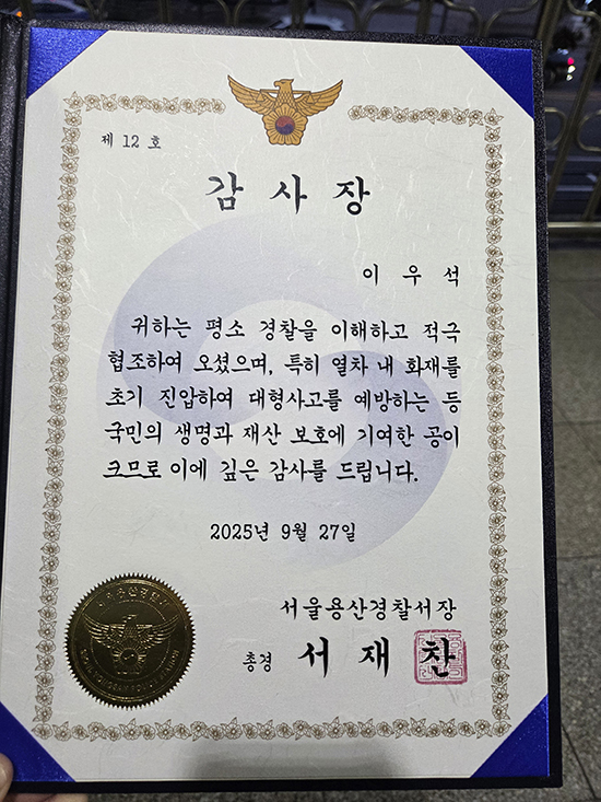 ÀÌ ¾¾ÀÇ Ä§ÂøÇÑ ´ëÀÀÀº °ü°è ±â°üÀÇ Ç¥Ã¢À¸·Îµµ À̾îÁ³´Ù. Áö³´Þ 27ÀÏ ¿ë»ê°æÂû¼¿¡¼ °¨»çÀåÀ» ¹Þ¾ÒÀ¸¸ç, ±×¸®°í ¼¿ï±³Åë°ø»ç ÃßõÀ¸·Î ¼¿ï½ÃÀÇȸ¿¡¼µµ ÀÌ´Þ 21ÀÏ Ç¥Ã¢ÀåÀ» ¹Þ±â·Î °áÁ¤µÆ´Ù. ±×´Â ¡°Å« ÇÇÇØ·Î À̾îÁú ¼ö ÀÖ¾ú´ø »óȲÀ» ¸·¾Ò´Ù´Â °Í¸¸À¸·Îµµ ´ÙÇàÀε¥, ÀÌ·¸°Ô ĪÂù°ú »ó±îÁö Áּż ¸ö µÑ ¹Ù¸¦ ¸ð¸£°Ú´Ù¡±°í ¼Ò°¨À» ¹àÇû´Ù.
