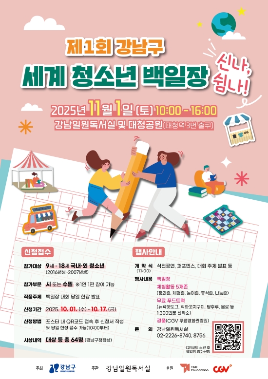 ¹éÀÏÀå¿¡´Â 9¼¼ºÎÅÍ 18¼¼±îÁö(2016³â»ý~2007³â»ý) ±¹³»¡¤¿Ü ±¹Àû û¼Ò³â ´©±¸³ª Âü¿©ÇÒ ¼ö ÀÖ´Ù. Çà»ç ´çÀÏ ÇöÀå¿¡¼ ±Û¾²±â ÁÖÁ¦°¡ Á¦½ÃµÇ¸ç ½Ã ¶Ç´Â ¼öÇÊ Áß ÇÑ ÆíÀ» ÀÛ¼ºÇØ Á¦ÃâÇÏ¸é µÈ´Ù. Æ÷½ºÅÍÀÇ ±âÀçµÈ QRÄڵ带 ÅëÇØ 10¿ù 17ÀϱîÁö »çÀü ½ÅûÀ» ÇÒ ¼ö ÀÖÀ¸¸ç Çà»ç ´çÀÏ ÇöÀå Á¢¼öµµ °¡´ÉÇÏ´Ù. Âü°¡ÀÚ´Â ½ÅºÐ È®ÀÎÀ» À§ÇØ ÇлýÁõÀ̳ª ¿©±ÇÀ» ÁöÂüÇØ¾ß ÇÑ´Ù.