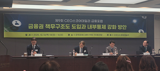 CEO½ºÄھÀϸ®´Â 16ÀÏ ¼­¿ï½Ã Áß±¸ ÇÁ·¹½º¼¾ÅÍ¿¡¼­ ¡®±ÝÀ¶±Ç Ã¥¹«±¸Á¶µµ µµÀÔ°ú ³»ºÎÅëÁ¦ °­È­ ¹æ¾È¡¯ Æ÷·³À» °³ÃÖÇÏ°í ³»ºÎÅëÁ¦¸¦ À§ÇØ Çѱ¹ ±ÝÀ¶ÀÌ ³ª¾Æ°¡¾ß ÇÒ ±æÀ» ³íÀÇÇß´Ù. À̹ø ¼¼¹Ì³ª´Â ±ÝÀ¶±ÇÀÇ ´ë±Ô¸ð Ⱦ·É µî ºÒ°øÁ¤ÇàÀ§¸¦ ¹æÁöÇϱâ À§ÇØ ±ÝÀ¶±ÇÀÌ ¼öÇàÇØ¾ß ÇÒ ³»ºÎ ÅëÁ¦¡¤Á¦ÀçÀÇ ¹æÇ⼺À» ¸ð»öÇϱâ À§ÇØ ¸¶·ÃµÆ´Ù.