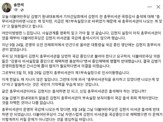 ¼Û¾ð¼® ±¹¹ÎÀÇÈû ¿ø³»´ëÇ¥°¡ 19ÀÏ ±èº´±â ´õºÒ¾î¹ÎÁÖ´ç ¿ø³»´ëÇ¥¸¦ ÇâÇØ ¡°°°Àº Ãѹ«ºñ¼­°üÀÌ¶óµµ ±èÇöÁö´Â ±¹Á¤°¨»ç¿¡ Ãâ¼®ÇÏ¸é ¾È µÇ°í, ½ÅÀÓ Ãѹ«ºñ¼­°üÀº Ãâ¼®ÇØ¾ß ÇÏ´Â °ÍÀ̳ġ±°í °­ÇÏ°Ô ºñÆÇÇß´Ù. ±è ¿ø³»´ëÇ¥°¡ ¡°Ãѹ«ºñ¼­°üÀ̶ó¸é Ãâ¼®ÇØ¾ß ÇÏÁö¸¸ ÇöÀç´Â Á¦1ºÎ¼Ó½ÇÀåÀ¸·Î ¹Ù²î¾ú±â ¶§¹®¿¡ ½ÅÀÓ Ãѹ«ºñ¼­°üÀÌ Ãâ¼®ÇÏ´Â °Ô ¸Â´Ù¡±°í ¹àÈù µ¥ ´ëÇÑ ¹Ý¹ÚÀÌ´Ù.